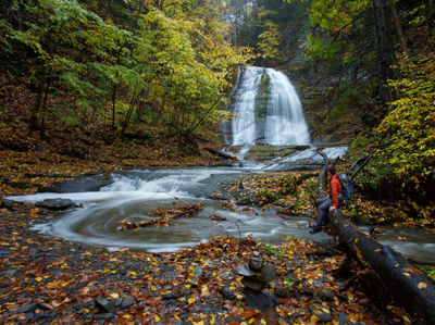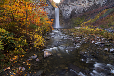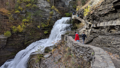 A NY State Park just outside of the City of Ithaca, with its namesake waterfall viewable from the parking lot. The scenic gorge trail (0.65 miles) works its way through a narrow gorge with smaller cascades to the Upper Park, where additional trails work their way through woodlands and around Lake Treman. Here you can connect with the long-distance Finger Lakes Trail (a 580-mile long trail connecting Allegheny State Park with the Catskills).