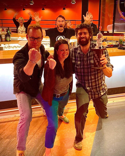 Not just a bowling alley, Atlas has a full kitchen with snacks (the tots con queso are a favorite), sandwiches, and tacos. The bar is made out of reclaimed flooring from a bowling alley and has very friendly bartenders. Atlas hosts a weekly trivia night, which has been won by Cat Parole Hearing (pictured here) on more than one occasion.